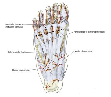 The plantar aponeurosis consists of three parts: medial, lateral, and central bands. The central band of the plantar aponeurosis is what is deemed as the plantar fascia. The plantar fascia originates at the calcaneal tuberosity and inserts itself into the heads of the metatarsals of the foot. The primary job of the plantar fascia is to aid in the toe-off portion of the gait cycle. The plantar fascia when working correctly also serves as a means of shock absorption for the foot. Plantar fasciitis occurs when the plantar fascia becomes inflamed. While the exact etiology of plantar fasciitis remains unclear, it is speculated that the inflammation is the result of repetitive micro trauma to the foot.